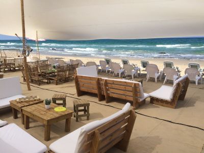 באוהל לייקרה שלנו כסאות ים, מיטות שיזוף, שמשיות, מחצלות שאנטי, פעמוני רוח, שרשראות צדפים, שרשאות פרחים ועלי נוי.